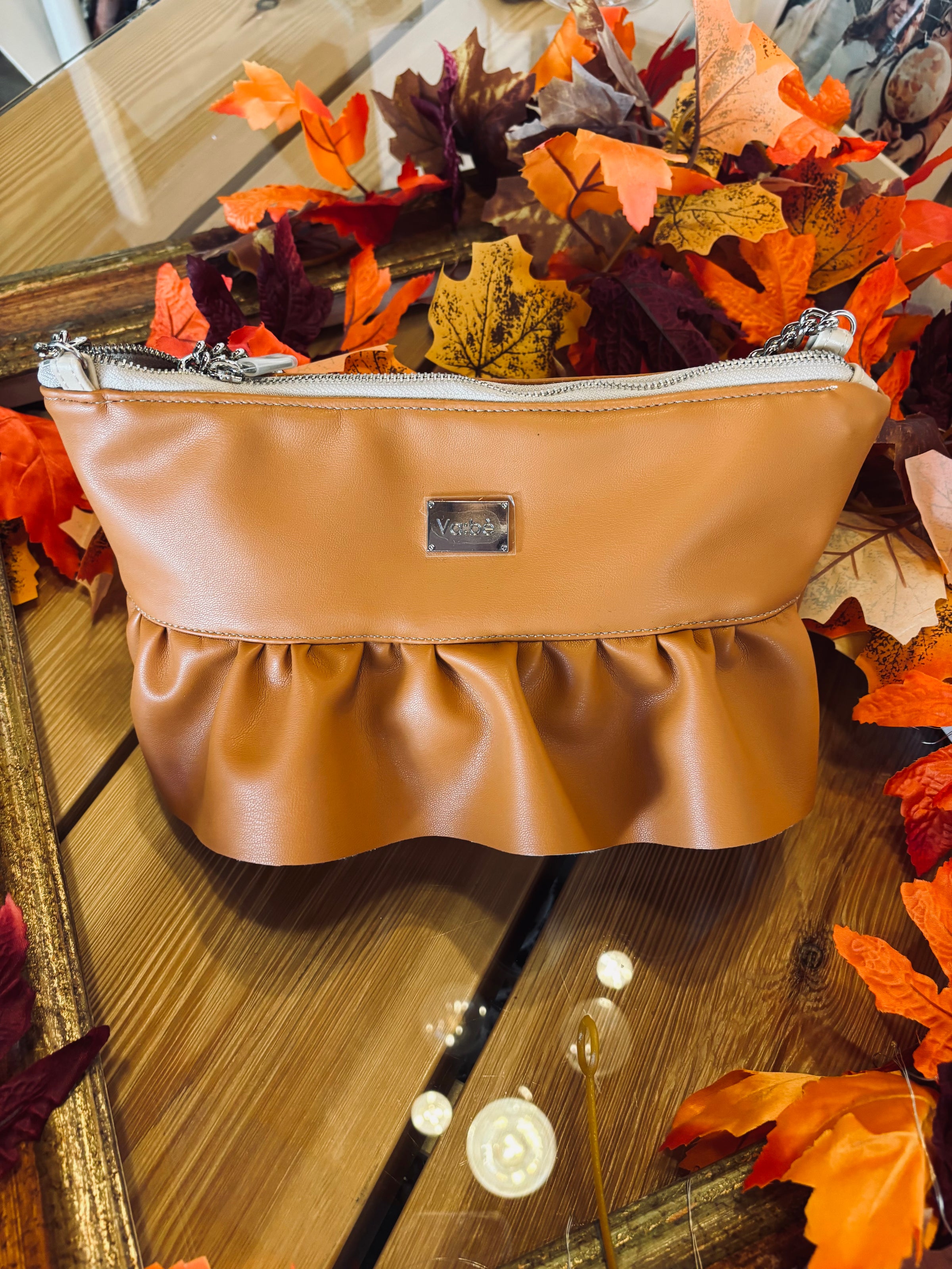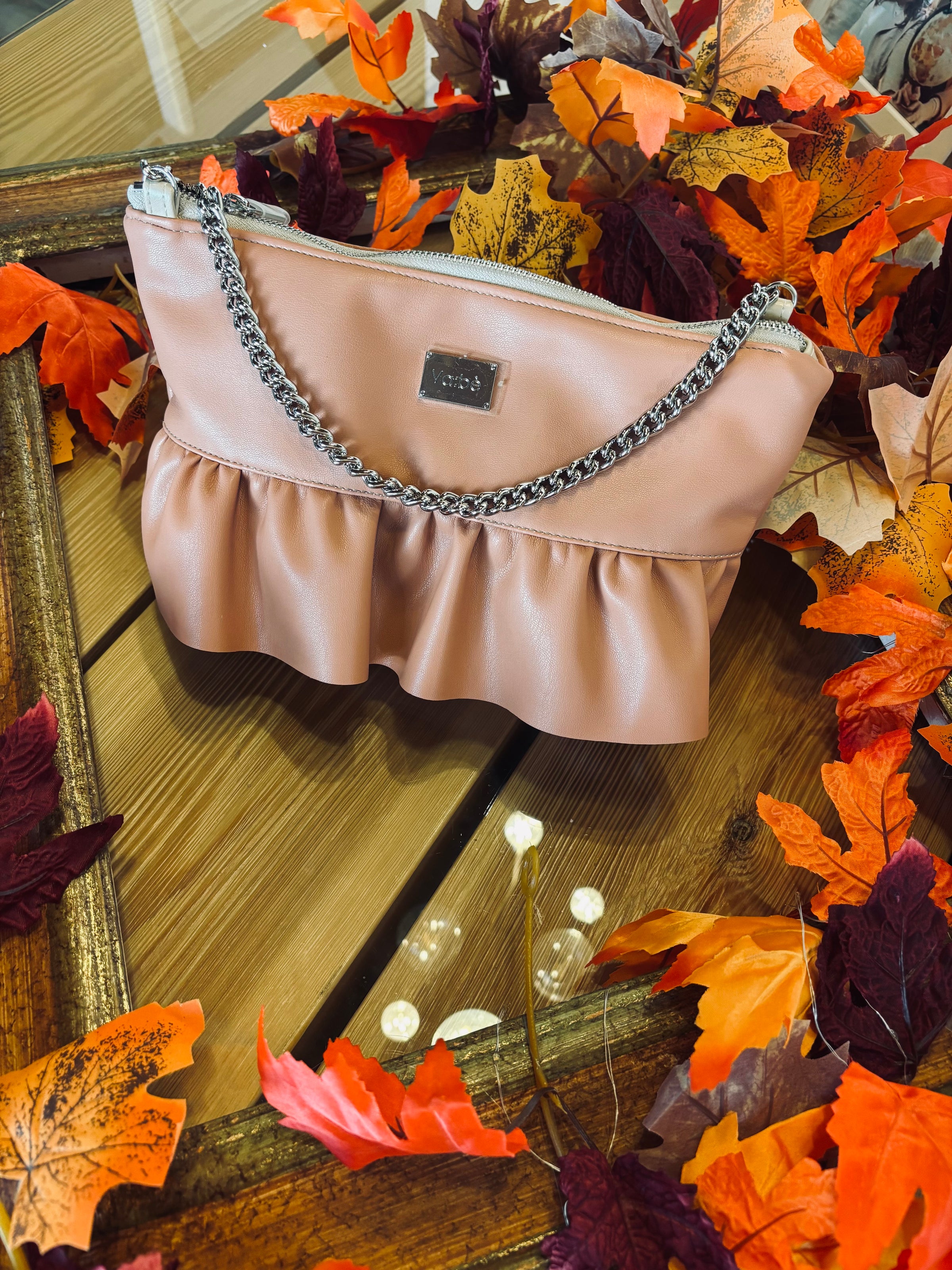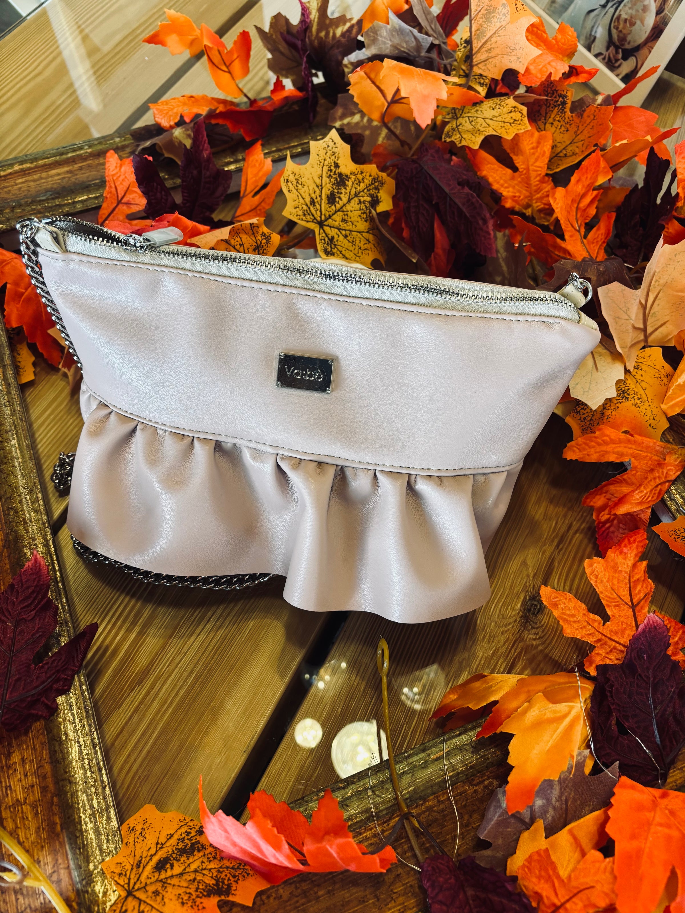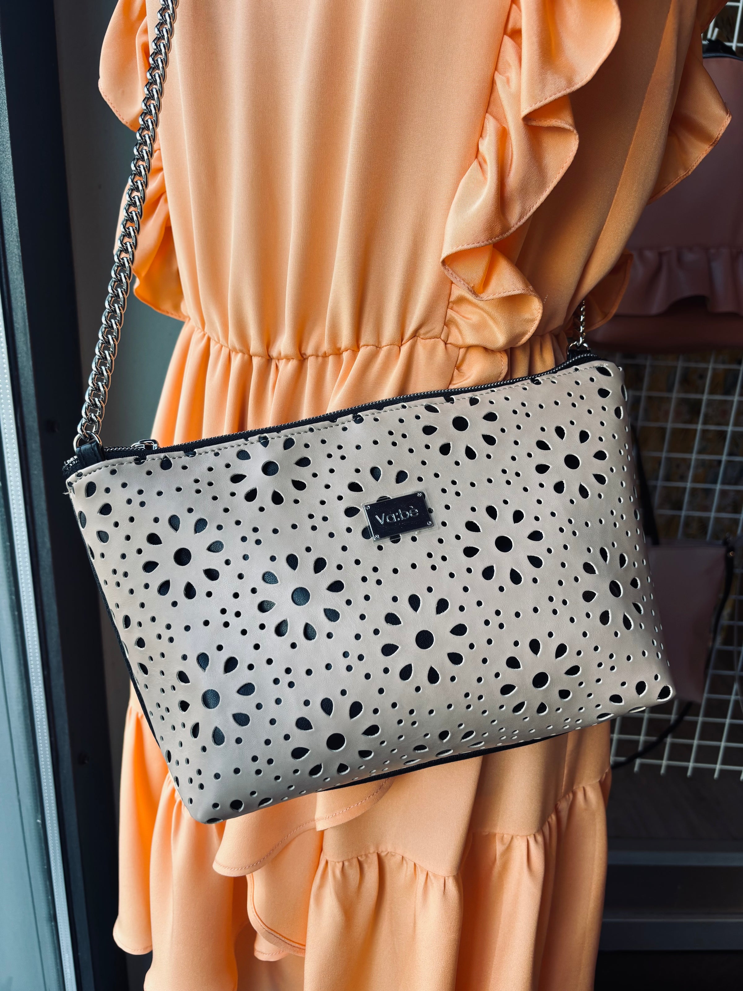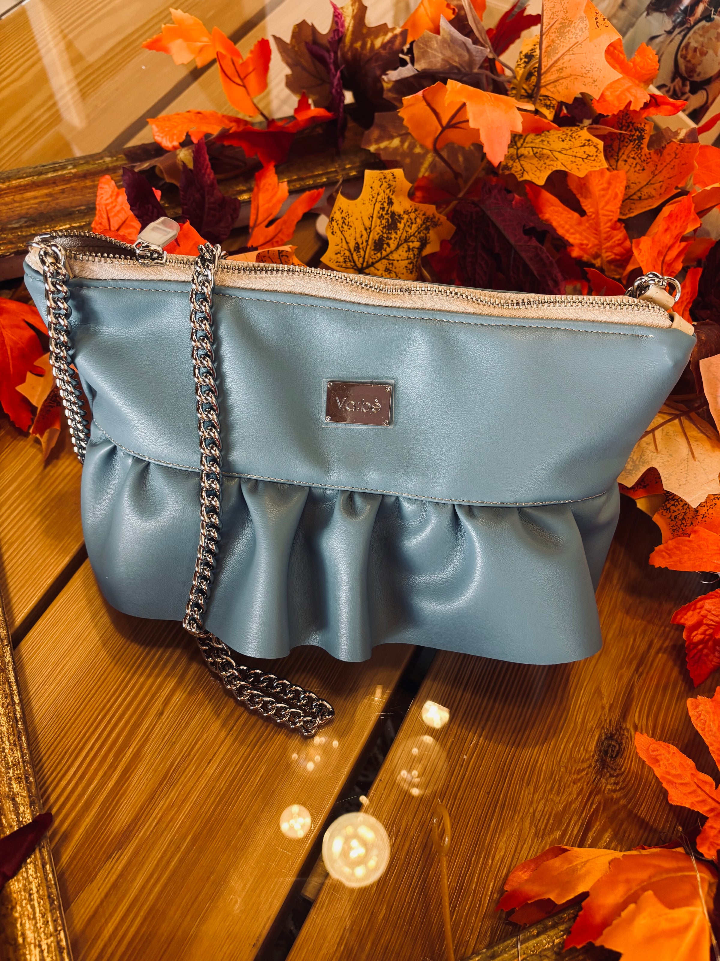 Borsa da sera da portare a tracolla, realizzata interamente a mano, dotata di catena.